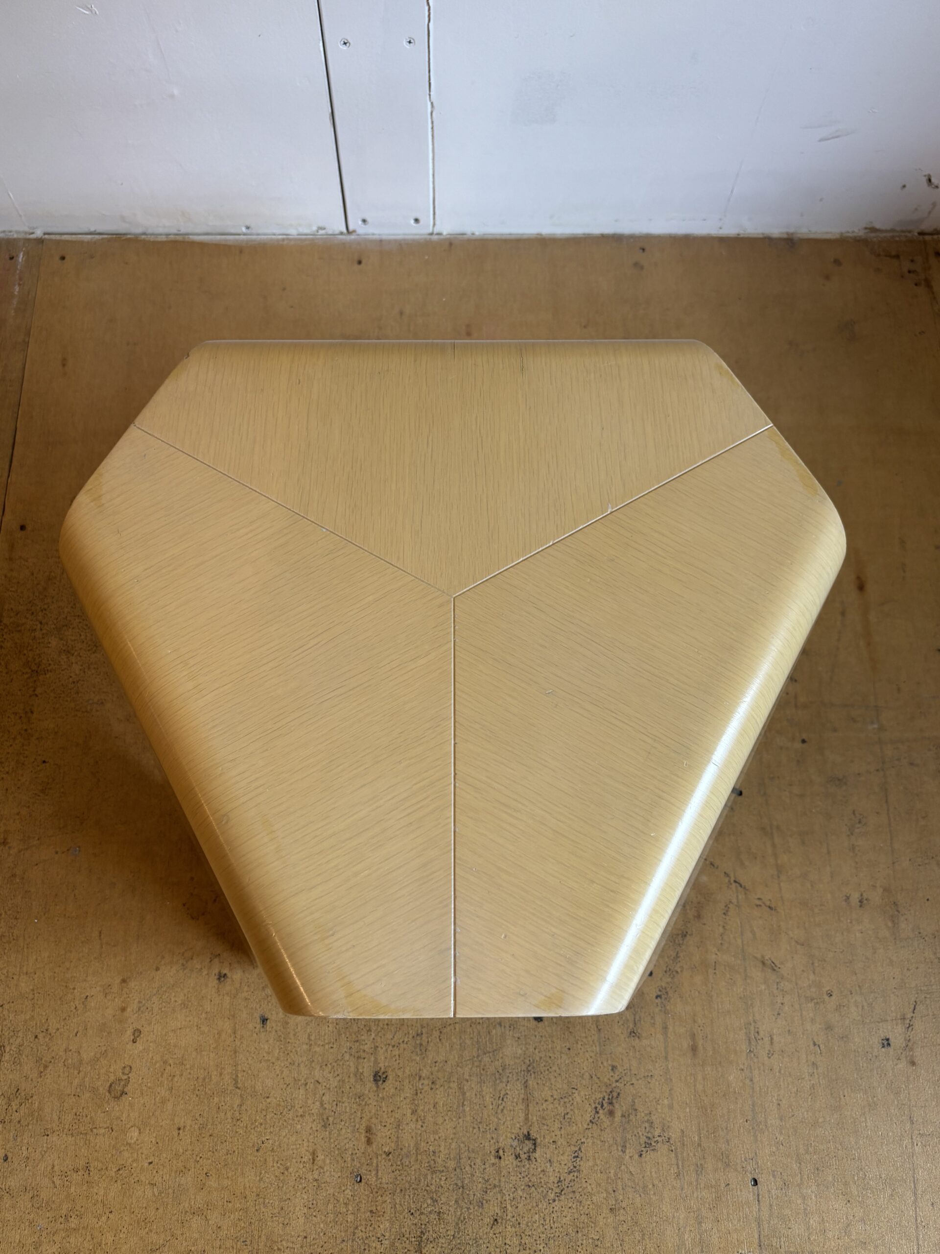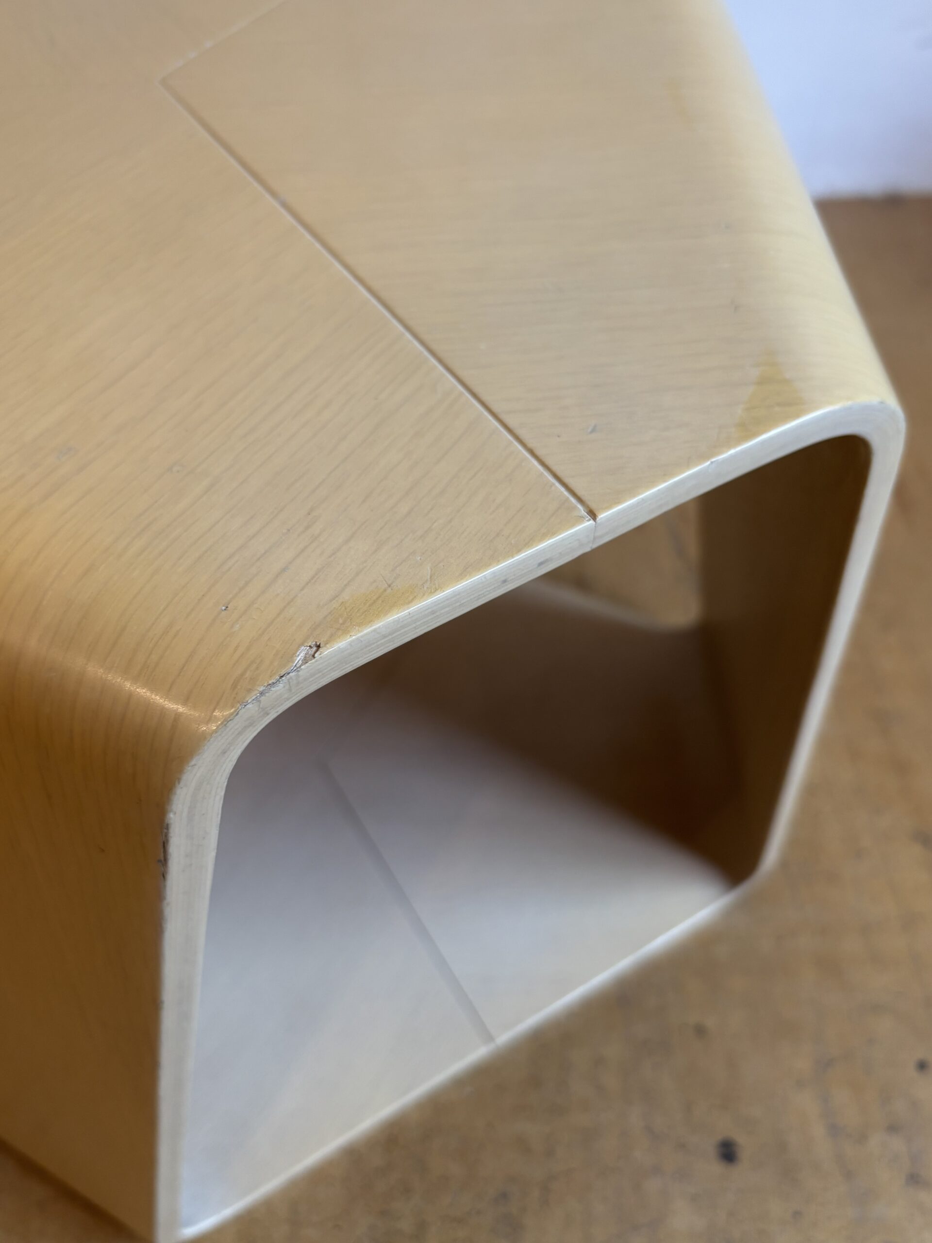 面を折り曲げたような幾何学的なデザインは、どの面を下にしても上面が水平になるため、安定して使用することができます。椅子やサイドテーブル、マガジンラックとして、更には積み重ねて棚のようにも使えます。使い手の想像力を刺激するスツールです。